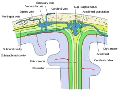 ![]() Representación diagramática de una sección a través de la parte superior del cráneo, mostrando las membranas del cerebro, etc. (El rótulo "granulación aracnoidea" está en la parte superior derecha). | ||