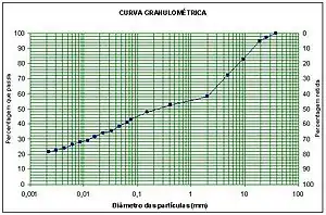 El modo más clásico y frecuente de representación de las distribuciones de tamaño de partícula es el diagrama semi-logarítmico. Los tamaños se representan en el eje de la abscisa mediante una escala logarítmica de base 10 (generalmente en μm) y las ordenadas en una escala aritmética, de 0 a 100 %.