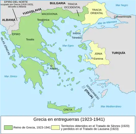 El periodo de entreguerras en Grecia fue un periodo político turbulento caracterizado por la alternancia de la monarquía y de la república, los sucesivos pronunciamientos militares a favor de las distintas opciones políticas y la continua debilidad económica del país. Estrictamente, el país no salió de la Primera Guerra Mundial hasta su derrota a manos de la nueva república turca en la guerra de 1919-1922[1] y no entró en la Segunda Guerra Mundial hasta el ataque italiano de octubre de 1940.