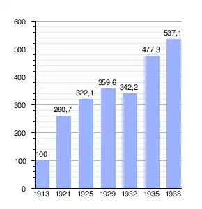 La industria creció notablemente en la época, pero desde un nivel muy bajo y con condiciones malas para los obreros, poco numerosos incluso en vísperas de la Segunda Guerra Mundial: eran 280 311 en 1930 y apenas superaban los 350 000 en 1938.[222] La mayoría de los obreros trabajaba además en talleres y pequeñas industrias, no en grandes fábricas, con escasas diferencias sociales, económicas o de origen con sus patronos.[225] A menudo propietario de una casa o de tierras en su pueblo de origen, ideológicamente estaba cercano a sus antiguos vecinos campesinos o de la pequeña burguesía.[226] Solo algunos sectores menores y grupos, como los refugiados, desarrollaron un movimiento obrero fuerte, pese a las malas condiciones laborales en la industria.[227][nota 14]