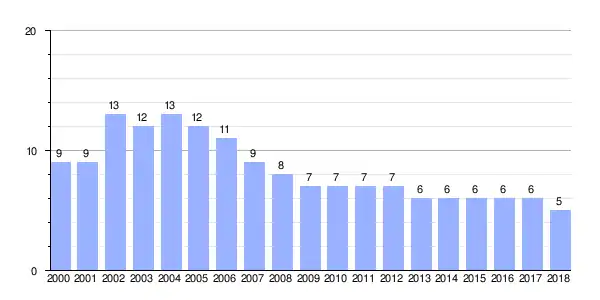 Gráfica de evolución demográfica de Grela entre 2000 y 2018 |