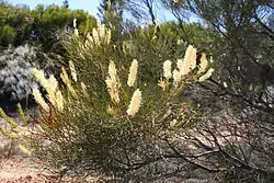 Es un arbusto erecto de 1.5-2.5 m de altura. Las hojas enteras, lineales (para adultos) u obovadas (juveniles), en ocasiones, ambas presentes, de 3-16 cm de largo, y 1.12 mm de ancho, seríceo en una o ambas superficies; hojas lineares con crestas longitudinales y márgenes oscuros; hojas obovadas. La inflorescencia axilar erecta, terminal o superior, simple o con pocas ramas ascendentes; de 13.4 (-18.5) cm de largo, cilíndrico; raquis floral , generalmente de color marrón ( de color amarillo) por debajo del indumento. Perianto glabro; tépalos libres y ascendente después de la antesis. Folículos de 7-13 mm de largo, estrecho y oblicuo obovoides.