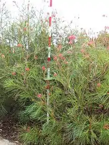 Tiene flores de color rojo anaranjado, las hojas largas y estrechas y alcanza un tamaño de 3 a 4 metros de altura y de 2 a 3 metros de ancho.