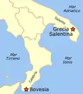 - Provincia de Regio de Calabria (Bovesia)[58]: Africo [58] (Άφρικον), Amendolea[58] (Amiddalia), Armo[69], Bagaladi[58] (Bagalades), Bova [58] (Chòra tu Vùa (Βοῦα), i Chora (ἡ Χώρα)[70]), Bova Marina (Jalo tu Vùa), Brancaleone[58], Cardeto[58][71] (Kardia), Cataforio[69] (Katachòrio), Condofuri[58][72] (Kontofyria, o Condochòri, con Κοντοχώρι «cerca del pueblo»[73]), Gallicianò[58], Gerace, Laganadi[69] (Lachanàdi, Lachanàdes), Lubrichi[69], Mélito di Porto Salvo[58] (Mèlitos o Mèlito), Montebello[58], Mosorrofa[69] (Messòchora), Motta San Giovanni[58], Palizzi[58] (Spiròpoli), Paracorio[69] (se fusionó en 1878 con la ciudad de Pedovoli[69] en la actual ciudad de Delianuova, Dhelia), Pentedattilo[72], Podàrgoni:[74] (Podàrghoni), Polistena[75], Regio de Calabria (Rìghi), Roccaforte del Greco[58] (Vuni con Βουνί «montaña»[76]), Roghudi[58] (Roghudion, Choriò, Richudi con ῥηχώδης «roca»[77]), Samo[58] (Samu), San Pantaleone[72], San Lorenzo[58][72], Santa Caterina[71][78], San. Giorgio[69], Scido[69] (Skidous), Sinopoli[79] (Xenòpolis, Sinopolis), Sitizzano[69], Staiti[58] (Stàti).
