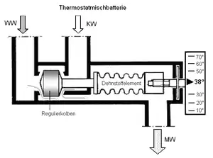 La pieza clave de un grifo termostático es el regulador alrededor del que fluye el agua mezclada. Consta de un alambre bimetálico enrollado en forma de resorte helicoidal, o bien de una cápsula llena de parafina, denominada elemento de expansión de cera. Ambos tipos de reguladores cambian de longitud de forma proporcional a los cambios de temperatura que experimentan. Las versiones que utilizan un cable bimetálico normalmente se pueden diseñar con cambios de longitud más amplios, lo que redunda en una mayor precisión en el control de la temperatura del agua.[2]