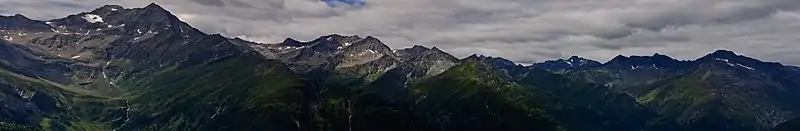 - El grupo Lasörling visto desde el refugio de Eissee y el valle de Timmeltal (en el eje del valle está el Berger Kogel )