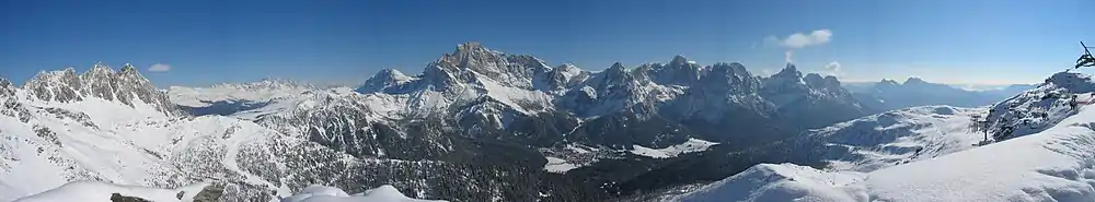 Panorámica sobre la cadena de las Palas, y a sus pies la localidad de San Martino di Castrozza.
