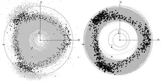 Figura 2: Las posiciones de los asteroides Hilda sobre un fondo de sus órbitas.
