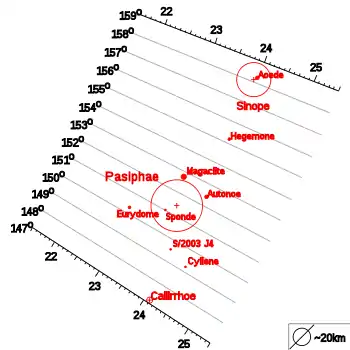 El Grupo de Pasífae es un grupo de satélites irregulares jovianos, que se encuentran orbitando entre 23 y 24 millones de km de Júpiter con una inclinación cercana a los 165º.