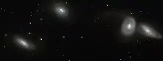 Un grupo compacto consiste en un pequeño número de galaxias, típicamente alrededor de cinco, muy cerca y relativamente aisladas de otras galaxias y formaciones. El primer grupo compacto que se descubrió fue el Quinteto de Stephan, encontrado en 1877.[9] El Quinteto de Stephan es un grupo compacto de cuatro galaxias más una de primer plano no asociada.[10] El astrónomo Paul Hickson creó un catálogo de tales grupos en 1982, los Grupos Compactos de Hickson.[11]