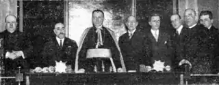 De izquierda a derecha: Zaragüeta, Aznar, nuncio Tedeschini, López Núñez, Sangro, Jornada de Pozas, Correas y Maseda.