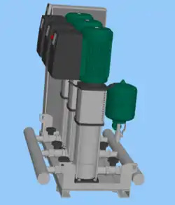 - convencional, que contará con un cisterna o depósito auxiliar de alimentación[4] y un grupo de bombeo formado por una o varias bombas de iguales prestaciones y funcionamiento alterno, montadas en paralelo y uno o varios depósitos de presión con membrana[5] y todo el conjunto provisto de dispositivos para la puesta en marcha y parada automáticas del grupo. El fraccionamiento de la potencia de bombeo es muy conveniente si se quiere optimizar el consumo de energía. La reglamentación española exige un mínimo de dos bombas y a partir de ahí, un número en función del caudal o de la zonificación del edificio.[6]