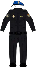 El uniforme básico de los agentes GOES se compone de un chaleco y casco antibalas y un subfusil MP5 con linterna acoplada.
