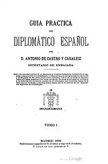 - Castro y Casaleiz, Antonio de (1886). Guía práctica del Diplomático Español 1. Establecimiento tipográfico de El Correo. Consultado el 9 de marzo de 2021.