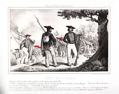 - Uniforme: Casaquilla gris con ojaladura amarilla en el pecho; pantalón grans (sic), boina encarnada; morral y alpargata.