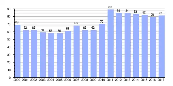 Gráfica de evolución demográfica de Guímara[2] entre 2000 y 2017 |