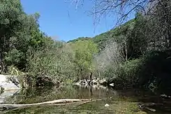 En sus primeros kilómetros el cauce discurre por un valle abierto, rodeado de matorrales y dehesas con escasa vegetación de ribera, formada principalmente por tamujos, adelfas y zarzas pero, a la altura de San Calixto, comienza a encajarse en el terreno, encajonamiento que se hace más patente después de la incorporación del Arroyo del Tinte y que se acentúa mucho más al aproximarse al Molino de la Paloma, hasta llegar a la Pasada de Algeciras (puente de la carretera CO-5310). Este tramo es el más espectacular pues el río se encañona entre paredones de antiguas calizas, con cavidades en las que habitan algunas especies de murciélagos y, por otra parte, salvo en épocas de lluvias y gran caudal, se produce la desaparición paulatina de sus aguas, que se filtran en el subsuelo reapareciendo unos kilómetros más abajo en una poza.