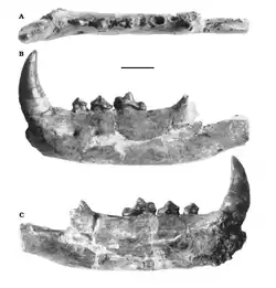 Dibujo del holotipo (IVPP V11818) con la mandíbula izquierda con p3-m1 y alvéolos para p1-2 y m²-3; En vistas oclusales (A) y laterales (B). Barra de escala 2 cm.