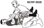 En defensa personal, esta posición contempla a veces un característico empujón con los pies o patada doble para apartar al oponente de sí el tiempo suficiente para que el usuario vuelve a la verticalidad.