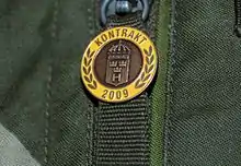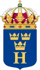 El escudo de armas de la Guardia Nacional desde 1940. Blasón: "Azure, la letra H debajo de tres coronas abiertas o, colocadas dos y una, todas o".[9]