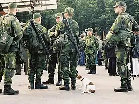 Los perros también se utilizan como sistemas de sensores, generalmente dos por cada pelotón. Los animales son emitidos y entrenados por una de las organizaciones nacionales de defensa auxiliar.