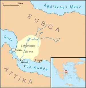 Calcis y Eretria eran puertos al oeste de la costa de Eubea. Ambas ciudades reclamaban la Llanura Lelantina, quizá porque originariamente utilizaban el río Lelas, que atraviesa la explanada de norte a sur, como frontera natural. Sin embargo, aunque Eretria está situada fuera de la llanura, la reclamaba desde antiguo. La razón probable es que Eretria fuera en principio el puerto de una ciudad situada más allá del Este. Esta ciudad estaría localizada en la desembocadura del río Lelas, cerca de la moderna Lefkandi. Su nombre antiguo es desconocido, así que generalmente se llama según el asentamiento actual. Lefkandi sufrió graves destrucciones en sobre el 825 a. C.,[15] tras la cual la mayoría de su población se habría trasladado a Eretria.