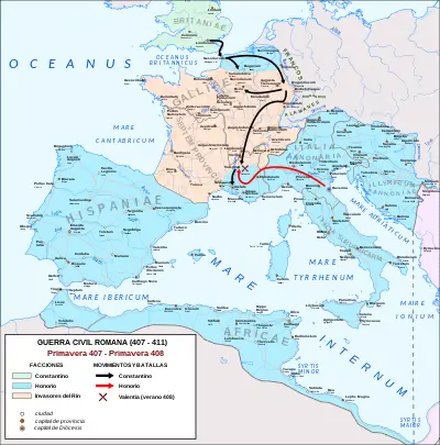 Constantino de Britania cruzó con sus tropas al continente donde se le unieron las de la Galia. Consiguió recuperar el área fronteriza junto al Rin y continuó por el valle del Ródano hacia Arlés. Las fuerzas de Honorio le hicieron frente, sin éxito, en Valentia.
