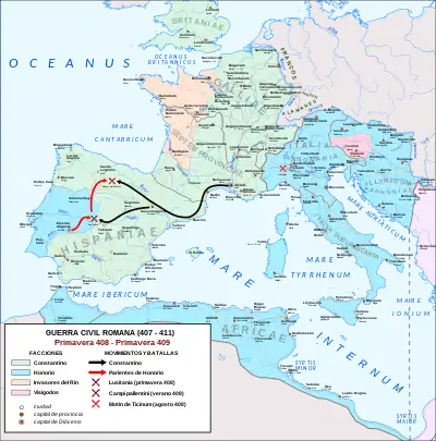 El último de los tres usurpadores —Constantino de Britania— cruzó el canal con las tropas en primavera de 407 y tanto el ejército como la aristocracia de la Galia se le unieron en masa al verlo como la única posibilidad de hacer frente a los invasores del Rin.[3] Ante el fracaso de su estrategia, el gobierno de Rávena envió, ese mismo verano, un nuevo ejército al mando de Saro para intentar acabar con Constantino pero fue derrotado y tuvo que retirarse a Italia.[4] El usurpador consiguió controlar la capital de la prefectura —Arlés— a inicios de 408 y tuvo bajo su mando toda la Galia donde optó por pacificar a los invasores bárbaros mediante acuerdos de asentamiento en el oeste y norte para poder, así, centrarse en su defensa ante otro posible ataque de Honorio y en controlar la diócesis de Hispania donde algunos parientes del emperador habían conseguido formar un ejército y rechazar un primer ataque de sus tropas.[5]