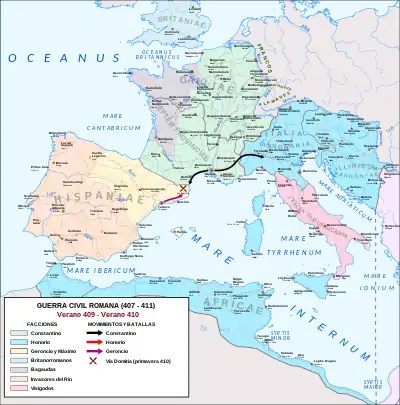 Avanzado ese 409, Constantino comenzó a perder el control de sus territorios.[8] Primero se rebeló la población de Britania ante el abandono en que habían quedado frente a ataques sajones mientras que en Armórica y las zonas donde se habían asentado los invasores del Rin, sus habitantes también formaron grupos de autodefensa que consiguieron expulsar a los invasores y a los funcionarios partidarios de Constantino.[8] Los bárbaros optaron, entonces, por pasar a Hispania en otoño sin que las tropas estacionadas allí y dirigidas por Geroncio les hiciesen frente.[9] Llegado el año 410, los invasores saquearon la península excepto la provincia de Tarraconense donde se situaban las tropas comandadas por Geroncio quien, en lugar de luchar contra ellos, se centró en rechazar el intento de Constantino para destituirle; nombró a un emperador alternativo Máximo y derrotó a las tropas que llegaron al mando de Constante.[10]