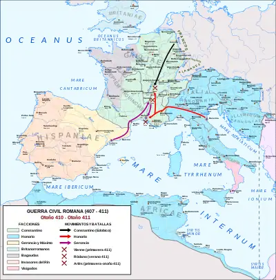 Cuando se inició el año 411 Geroncio, por su parte, quiso aprovechar la débil situación de Constantino e invadió la Galia.[69] Su primer objetivo fue evitar que Constante consiguiese llegar al norte para movilizar a las unidades fronterizas y para ello, se dirigió hacia el valle del Ródano para interceptarlo.[12] Este optó por refugiarse en Vienne donde fue sitiado por el ejército de Geroncio.[12] Poco pudo resistir porque, en unas semanas, la ciudad fue tomada y Constante ejecutado.[12] Geroncio se dirigió, entonces, hacia el sur para enfrentarse a Constantino quien, con sus escasas tropas, nada pudo hacer salvo encerrarse en Arlés y resistir el asedio de su antiguo subordinado a la espera de que Edobico llegase con refuerzos desde el Rin.[12]