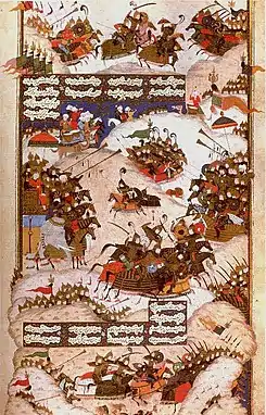 ![]() Arte medieval iraní que ilustra a Cosroes II y Bahram Chobin en una batalla | |||||