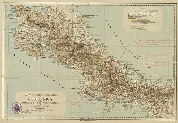 Durante el siglo XIX Costa Rica fijó su frontera con Colombia a partir del río Chiriquí Viejo, la cordillera Central y el río Calovébora hasta la isla Escudo de Veraguas (línea amarilla). Con ello, buscaba reclamar la zona de Bocas del Toro.