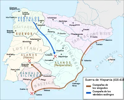 Durante dos años, los invasores extendieron la destrucción por el resto de las provincias hispanas en la península hasta que, en 411, decidieron repartírselas entre ellos.[1] Los alanos eran el grupo más importante y se quedaron con dos: Lusitania y Cartaginense. A los vándalos silingos, por su parte, les correspondió la Bética mientras que los vándalos asdingos y los suevos se tuvieron que repartir la provincia más pequeña de todas: la Gallaecia.