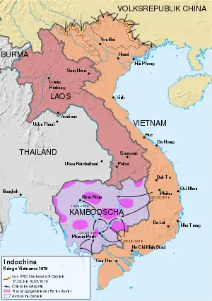 La República Democrática de Vietnam (Vietnam del Norte), que había optado por aliarse con la URSS, justificó las incursiones en los vecinos reinos de Laos y Camboya durante la Guerra de Vietnam en referencia al carácter internacional de la revolución comunista, donde "Indochina es una única unidad estratégica, un solo campo de batalla y el papel fundamental del Ejército Popular de Vietnam para lograrlo".[10] Sin embargo, este internacionalismo se vio obstaculizado por complicadas realidades históricas regionales, como las "oposiciones intemporales entre los chinos y los vietnamitas por un lado y los vietnamitas y los jemeres por el otro".[11] Vietnam del Norte intervino en la guerra civil entre el Real Ejército Lao y la guerrilla Pathet Lao hasta el establecimiento de la República Democrática Popular Lao y el "Tratado de Amistad y Cooperación" firmado en julio de 1977. Las tropas norvietnamitas estacionadas permanentemente aseguraron y mantuvieron suministros vitales de rutas y lugares estratégicos de parada (sendero Ho Chi Minh). A partir de 1958, las tropas de combate vietnamitas del norte y del sur también comenzaron a infiltrarse en las selvas remotas del este de Camboya, donde continuaron el camino de Ho Chi Minh. Los insurgentes comunistas camboyanos se habían unido a estos santuarios a finales de la década de 1960. Aunque hubo cooperación, los combatientes del Partido Comunista de Kampuchea no adoptaron las doctrinas socialistas modernas de la URSS y finalmente se aliaron con China.[12][13]