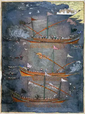 ![]() Cosacos zaporogos aliados en botes chaika atacando a las galeras turcas en el mar Negro, 1636 | ||||