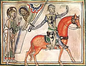 ![]() Guido de Dampierre a caballo. Su sobreveste lleva las armas del condado de Flandes | ||