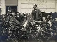 Gömbös presidía desde el 19 de enero de 1919 también un grupo paramilitar, la Asociación para la Defensa Nacional Húngara (en húngaro, Magyar Országos Véderő Egylet, o MOVE),[16][12][1] —formada por veteranos de guerra y fundada en noviembre de 1918—[2] a la que Horthy animó a los oficiales a afiliarse a finales de 1919.[17] La organización tuvo notable influencia en el periodo contrarrevolucionario y fue una de las primeras organizaciones fascistas europeas.[18] Otro de los cofundadores fue el capitán Pál Prónay, tristemente célebre por acaudillar el principal destacamento paramilitar del periodo contrarrevolucionario —con el que mantuvo, empero, tensas relaciones—.[19] Gömbös la había tratado de utilizar en vano para destruir el Gobierno revolucionario de Mihály Károlyi a comienzos de 1919 creando una red nacional de oficiales opuestos a él.[20] El 22 de febrero de 1919 había sido prohibida junto con el Partido Comunista Húngaro y Gömbös había huido a Viena tres días más tarde.[20] Allí había vuelto a reunir a un grupo de contrarrevolucionarios.[20] Ya entonces Gömbös defendía una política diferente de los reaccionarios, un pseudosocialismo, populismo agrario que él mismo definió en abril de 1919 como «nacionalsocialismo»,[7] que se alejaba de Marx y rechazaba la expropiación de la propiedad privada o la nacionalización de los medios de producción.[21] Su nacionalismo y radicalismo agrario eran contrarios a los intereses de la aristocracia, pero populares entre ciertos sectores como los oficiales y funcionarios exiliados.[22][8] Fundamentalmente, Gömbös representaba a la pequeña burguesía.[8] La alianza entre aristócratas y radicales de derecha se debía a la oposición de los dos grupos a los Gobiernos revolucionarios, primero de Károlyi y luego de Kun.[22] Ante los repetidos fracasos de los contrarrevolucionarios en Austria para acabar con los Gobiernos de Budapest, muchos oficiales, entre ellos Gömbös, pasaron a Szeged.[23]