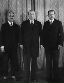 El 17 de marzo de 1934, Hungría firmó en Roma un acuerdo político y económico con Austria e Italia que aumentó[1] sustancialmente las exportaciones de grano a los dos países a la vez que los unía más políticamente.[80][81][73][82] Los acuerdos, reforzados en marzo de 1936, ayudaron a aliviar al grave crisis económica húngara,[1] reforzaron su posición frente a sus vecinos hostiles de la Pequeña Entente y permitieron la supervivencia temporal de Austria, evitando la vecindad de un gran imperio alemán.[83] No abandonó, no obstante, su deseo de lograr el entendimiento entre Roma y Berlín: a diferencia de Mussolini, que tras el asesinato del canciller austriaco Engelbert Dollfuss envió tropas a la frontera, Gömbös se limitó a condenar el atentado y a persuadir a aquel de que no ocupase Austria.[84] Se oponía a la anexión alemana del país, pero no estaba dispuesto a desagradar a Berlín y perder su apoyo, que creía necesario para lograr la recuperación de territorios checoslovacos.[84] En mayo de 1935, rechazó firmar un pacto de asistencia mutua con Austria.[85] Por otra parte, el estallido de la grave crisis por los asesinatos de Marsella[73] a finales de 1934 agudizó la dependencia húngara de Italia, su único respaldo en la Sociedad de Naciones ante las acusaciones de colusión en las muertes.[86][87]