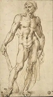 Esta obra se realizó en una escala gigantesca y por el dibujo de Rubens se aprecia que se representó como un héroe joven con la cabeza girada hacia un lado, la clava apoyada en el suelo formando una diagonal, mientras la figura parece que está en reposo, el conjunto aparece como una estatua antigua, sin embargo los pliegues de la vestimenta están inspirados en el san Jorge de Donatello. Por los escritos de Ascanio Condivi se sabe la medida que era de “Bracia quatro”, es decir, 2,40 metros.