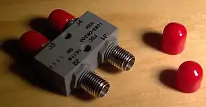 En radio frecuencias se llama híbrida, a un circuito de cuatro puertas, numeradas 1, 2, 3 y 4, de tal modo que la potencia incidente por 1 se reparte entre las puertas 2 y 3, normalmente a partes iguales, quedando la 4 aislada. Las híbridas se caracterizan por la relación de fase entre las puertas 2 y 3. Así tenemos híbridas de 90°, de 180°, etc. Existen diversas realizaciones en distintas tecnologías, según la frecuencia de trabajo: en guía de ondas, microstrip y bobinas.