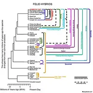 El gato doméstico, conocido como Felis catus, F. silvestris catus, o F. Lybica catus, un descendiente del gato montés africano (F. lybica), se ha hibridado con varias especies de felinos salvajes. La mayoría de estos son híbridos artificiales (es decir, criados intencionalmente por humanos), aunque se han producido algunas hibridaciones en la naturaleza.