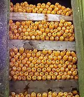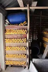 Las mazorcas se acopian en la cámara del hórreo con la ayuda de tablas transversales que la dividen en sectores, formando tabiques efímeros y discontinuos que permiten el paso del aire. Las tablas van separadas por intervalos en los que las mazorcas van colocadas paralelamente y con la parte más estrecha hacia adentro. Si el hórreo está lleno se dispone un tabique similar en la puerta. Cuando el hórreo es muy ancho los tabiques son longitudinales y dejan entre ellos un espacio central de acceso. En cualquier caso estos tabiques provisionales no pasan de los dos tercios de la altura interior libre de la cámara y dejan siempre abierta la parte superior.[12]