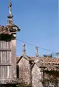 - Cruces. Son más frecuentes en los hórreos de realización más cuidada, de manera que se puede decir que por lo menos la mitad de los hórreos no llevan cruz. La presencia de la cruz se corresponde casi directamente con el tipo de hórreo, predominando en los tipos pétreos y menos en los de madera.