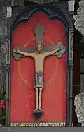 El crucifijo está colocado sobre un fondo rojo cubierto de estrellas doradas. [12] El marco lleva un lema en latín, Salve Crux Pretiosa (Salve, preciosa cruz). [7] Según los franciscanos locales, ocasionalmente ocurren milagros en el sitio. [12]