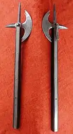 Un hacha de armas es la versión militar de las tradicionales hachas de leñador. En su versión de hacha de guerra, además de la hoja principal tiene uno o dos «petos» (púas, pinchos, picos) adicionales, colocados en el opuesto de la cuchilla, y otras veces lo tiene además en la parte superior del asta y sirve para estocar. En sus versiones medievales, normalmente el asta está «ferrada» (refuerzos metálicos) en sus últimos tercios o bien es totalmente metálica.