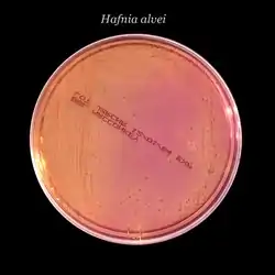 Hafnia alvei es una bacteria gramnegativa del género Hafnia. Fue descrita en el año 1954.[1] Su etimología hace referencia a colmena. Es una enterobacteria en forma de bacilo, anaerobia facultativa, con flagelación perítrica. Está ampliamente distribuida en la naturaleza, de forma que se puede encontrar en el ambiente (tanto suelos como aguas),[2] en animales y en la microbiota intestinal humana. Además, se la considera un patógeno oportunista, por lo que en algunos casos es causante de diversas infecciones tanto en animales como en humanos. Por otro lado, suele encontrarse en alimentos, sobre todo productos lácteos y cárnicos, ya que tiene un papel importante en su maduración.