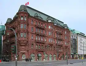 Tras la demolición del Bazar, se construyó en su lugar entre 1881 y 1883 el hotel Hamburger Hof, obra de los arquitectos Bernhard Hanssen y Emil Meerwein.[5] Con su destacada fachada neobarroca,[1][4] fue realizado en arenisca roja del Main (un tipo de arenisca típico de las edificaciones de Hamburgo de la época)[4] y decorado con esculturas del arquitecto colonés Engelbert Peiffer.[6] Su tejado original destacaba en el panorama de la ciudad por sus conspicuos elementos arquitectónicos, principalmente frontones, pináculos y agujas.[6]