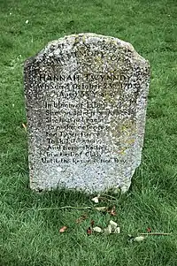 Su muerte está registrada en el registro parroquial de Malmesbury, que registra un entierro el 23 de octubre de 1703 de "Hannah Twynney [ sic ] asesinada por un tigre en el White Lyon". [1] Su lápida continua en un rincón del cementerio de la Abadía de Malmesbury, con un poema conmemorativo en alusión a su muerte tallado. Un anticuario registró una placa conmemorativa con más detalles en la iglesia del pueblo cercano de Hullavington, pero desde entonces se ha perdido.