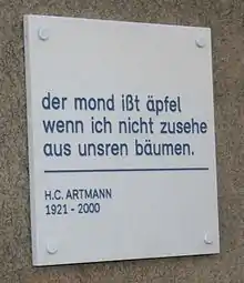 Desde el año 2016 existe una placa en el número 43 de la calle Kienmayergasse de Viena en recuerdo de Artmann.