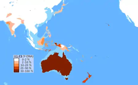 - C1b2a1 (M208) en Indonesia, Nueva Guinea[11] y demás islas del Pacífico, especialmente en Polinesia.